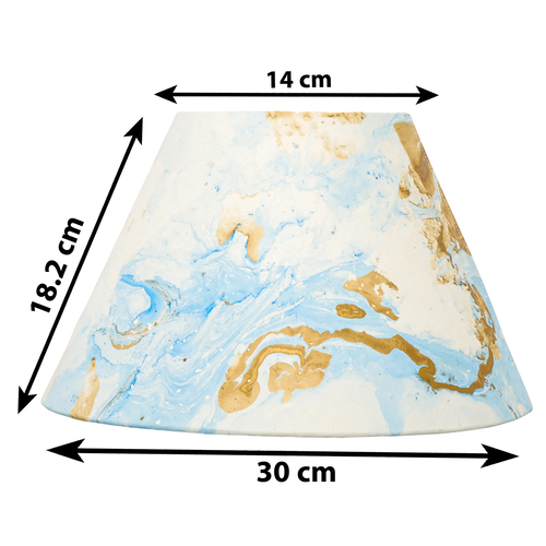A hardback premium marble paper shade handmade by incredibly skilled craftswoman. This is a 30cm size (bottom diameter) lampshade which is designed to work with a British (B22) or European (E27/E14) bulb holder. We also provide a reducer ring that allows shades to sit comfortably on a B22 holder. If it is E27/E14, simply push out the reducer. This lampshade can be used as pendant/hanging or on top of table lamps/floor lamps. Our shades are completely handmade and yet of top quality, eco-friendly, and of course 100% made in India. Dimensions (cms) : Top - 14, Bottom- 30, Height - 18.2