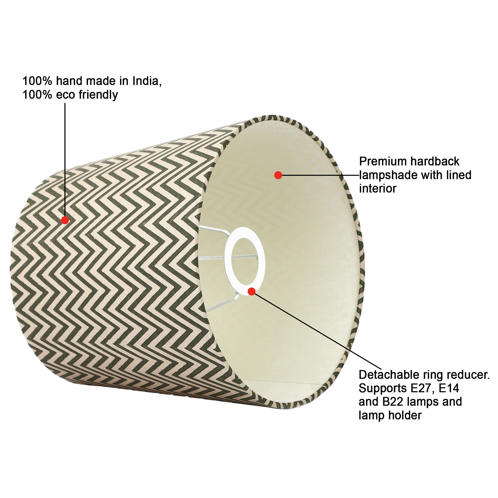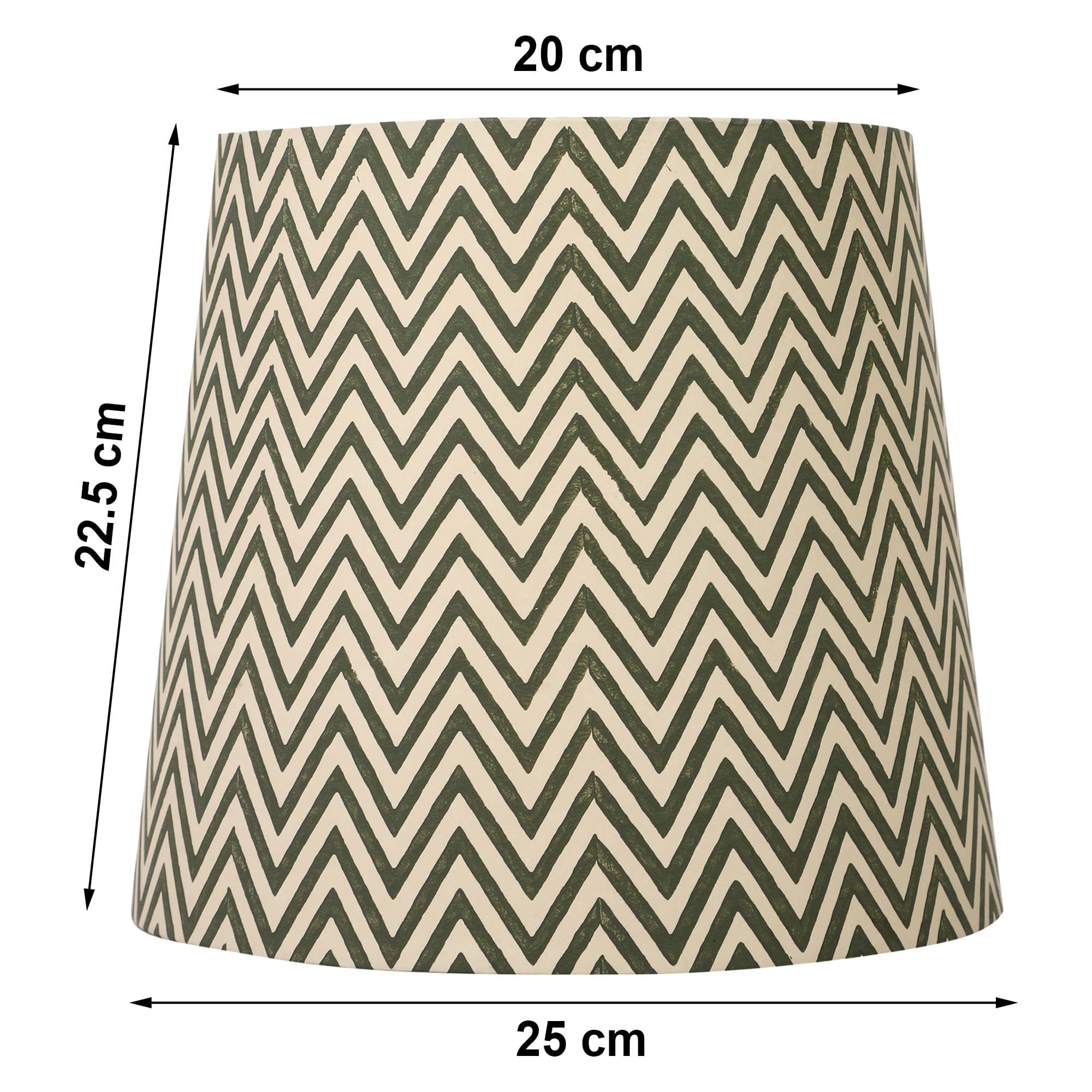 A hardback premium printed paper shade handmade by incredibly skilled craftswoman. This is a 25cm size (bottom diameter) lampshade which is designed to work with a British (B22) or European (E27/E14) bulb holder. We also provide a reducer ring that allows shades to sit comfortably on a B22 holder. If it is E27/E14, simply push out the reducer. This lampshade can be used on top of table lamps or floor lamps. Our shades are completely handmade and yet of top quality, eco-friendly, and of course 100% made in India. Dimensions (cms) : Top - 20, Bottom- 25, Height - 22.5