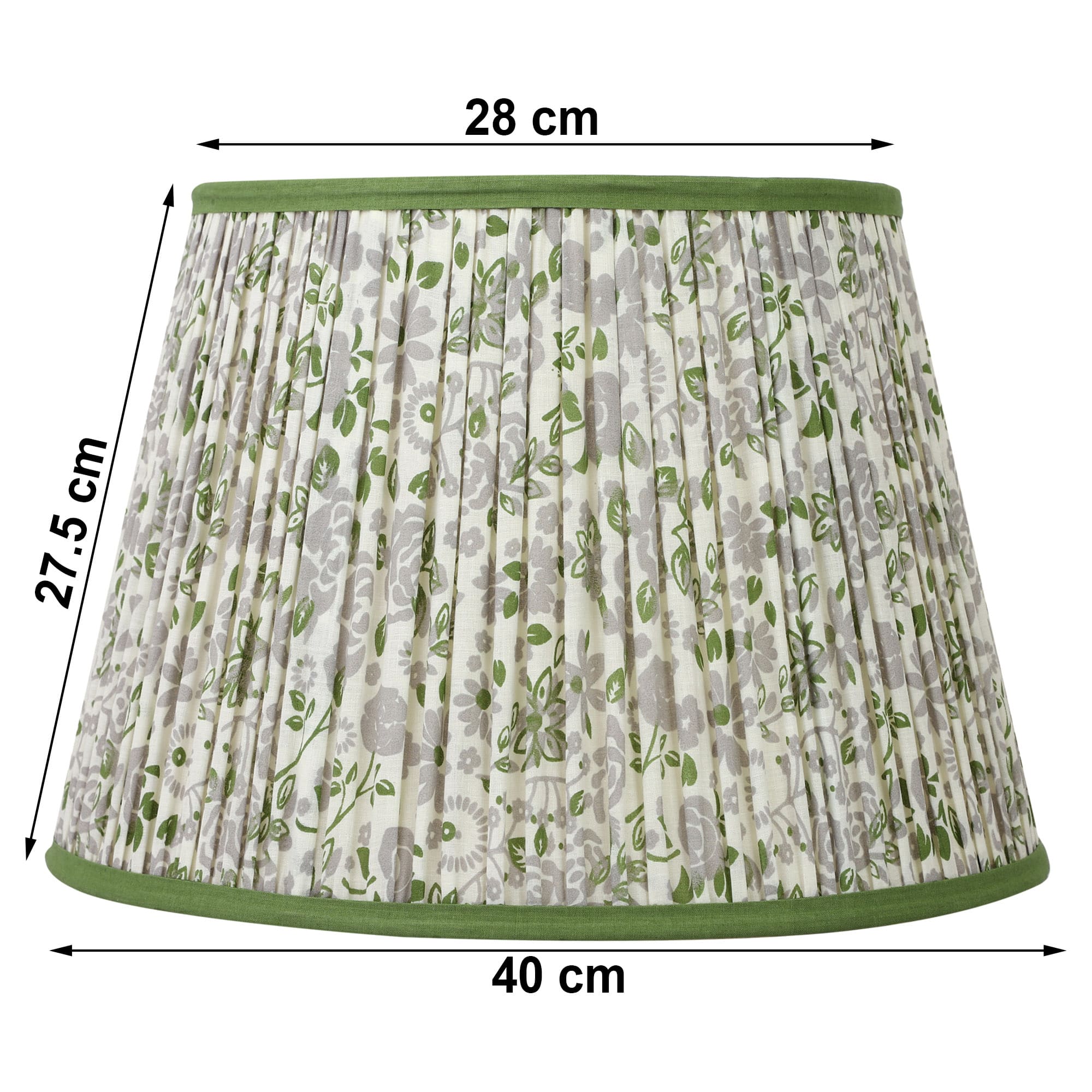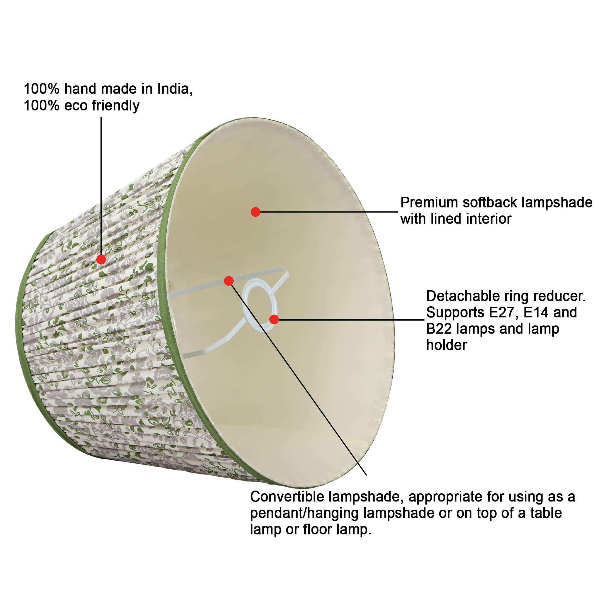 A softback printed cotton shade handmade by incredibly skilled craftswoman. This is a 40cm size (bottom diameter) convertible lampshade which is designed to work with a British (B22) or European (E27/E14) bulb holder. We also provide a reducer ring that allows shades to sit comfortably on a B22 holder. If it is E27/E14, simply push out the reducer. This lampshade can be used as pendant/hanging or on top of table lamps/floor lamps. Our shades are completely handmade and yet of top quality, eco-friendly, and of course 100% made in India. Dimensions (cms) : Top - 28, Bottom- 40, Height - 27.5
