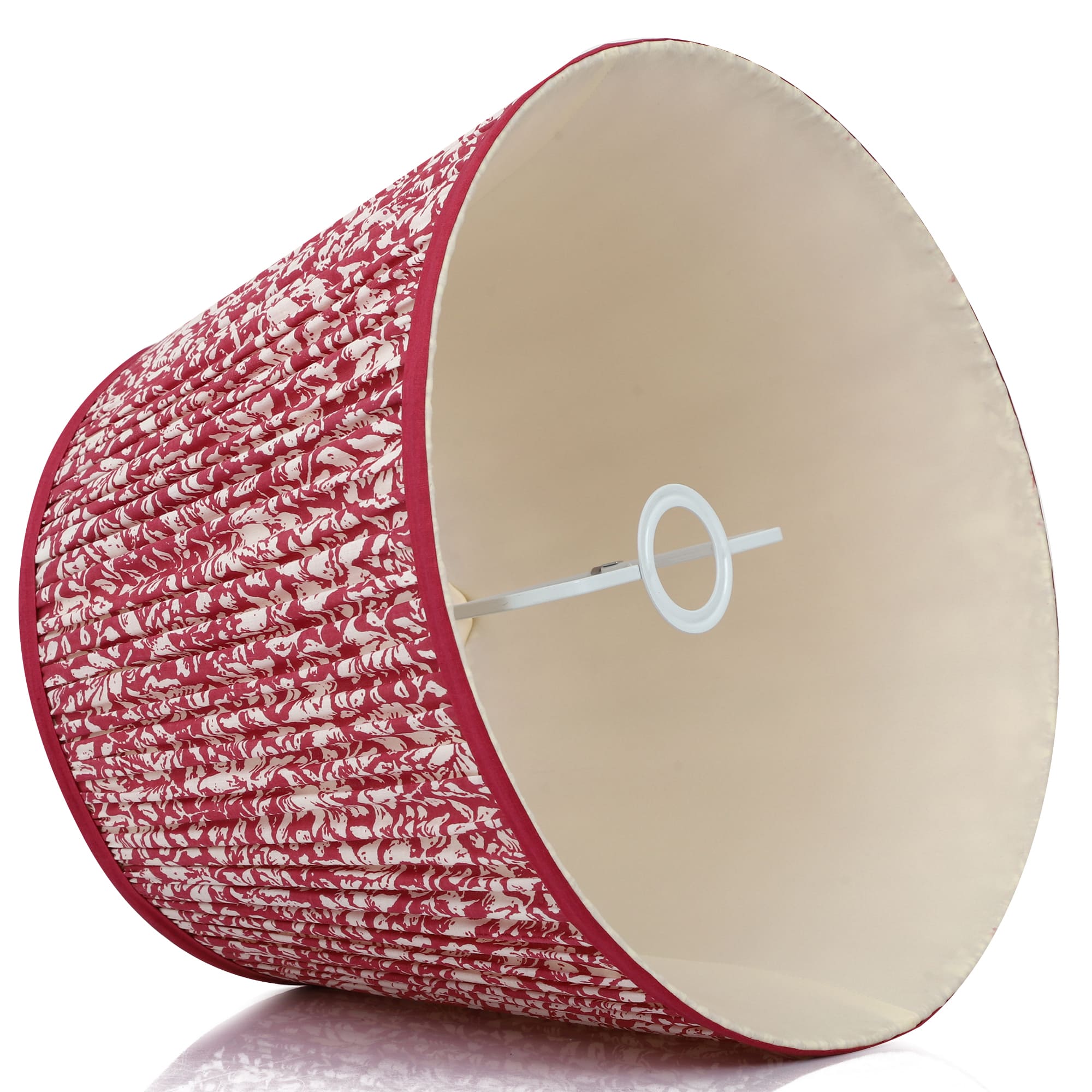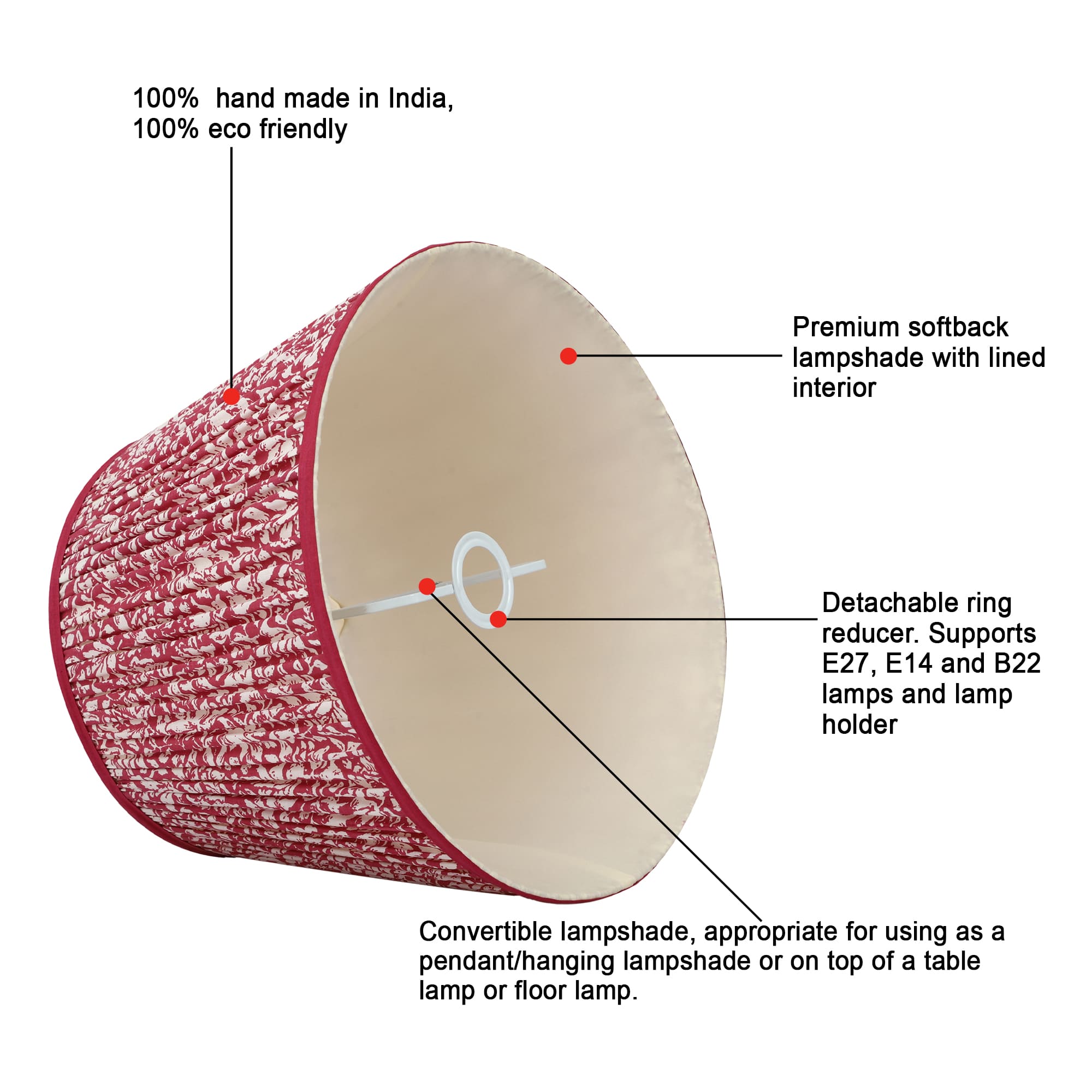 A softback printed cotton shade handmade by incredibly skilled craftswoman. This is a 40cm size (bottom diameter) convertible lampshade which is designed to work with a British (B22) or European (E27/E14) bulb holder. We also provide a reducer ring that allows shades to sit comfortably on a B22 holder. If it is E27/E14, simply push out the reducer. This lampshade can be used as pendant/hanging or on top of table lamps/floor lamps. Our shades are completely handmade and yet of top quality, eco-friendly, and of course 100% made in India. Dimensions (cms) : Top - 28, Bottom- 40, Height - 27.5
